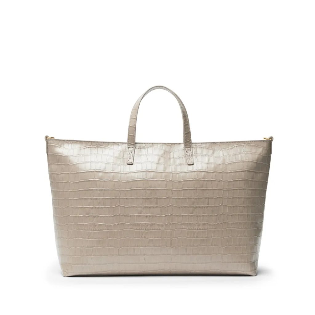 With a classy yet versatile silhouette, the Kress Top Handle Tote is a weekend tote bag that can be carried as a cross-body or as a top handle bag. The exterior leather features an ecru-croc color and polished gold hardware accents for added elegance.