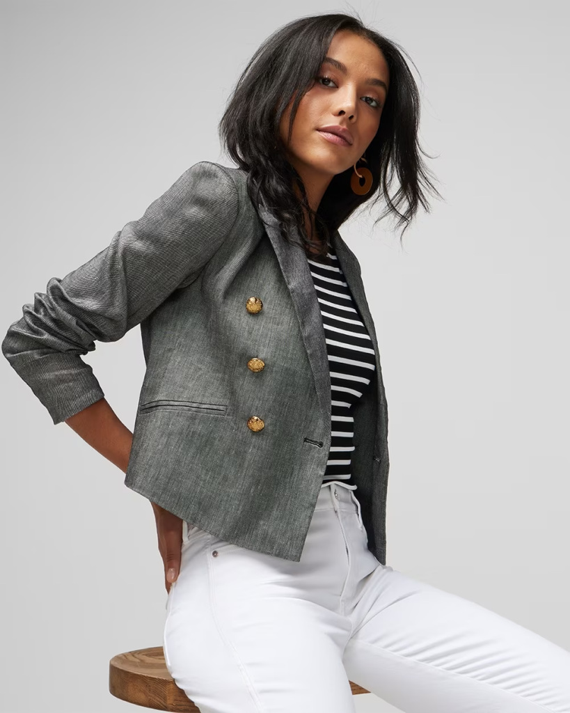 The Cropped Linen-Blend Studio Blazer from White House Black Market is a stylish and versatile piece that brings a modern twist to classic tailoring. Made from a linen blend, this blazer offers a lightweight and breathable option for warmer days. The cropped length adds a trendy touch and allows for easy layering and movement. It features a slim fit with a single-button closure and a notched lapel, combining a sleek silhouette with contemporary style. This blazer can be dressed up with tailored pants or a skirt for a polished look, or paired with jeans or shorts for a casual and chic outfit. The Cropped Linen-Blend Studio Blazer is a fashionable addition to any wardrobe, perfect for adding sophistication and flair to your ensembles.
